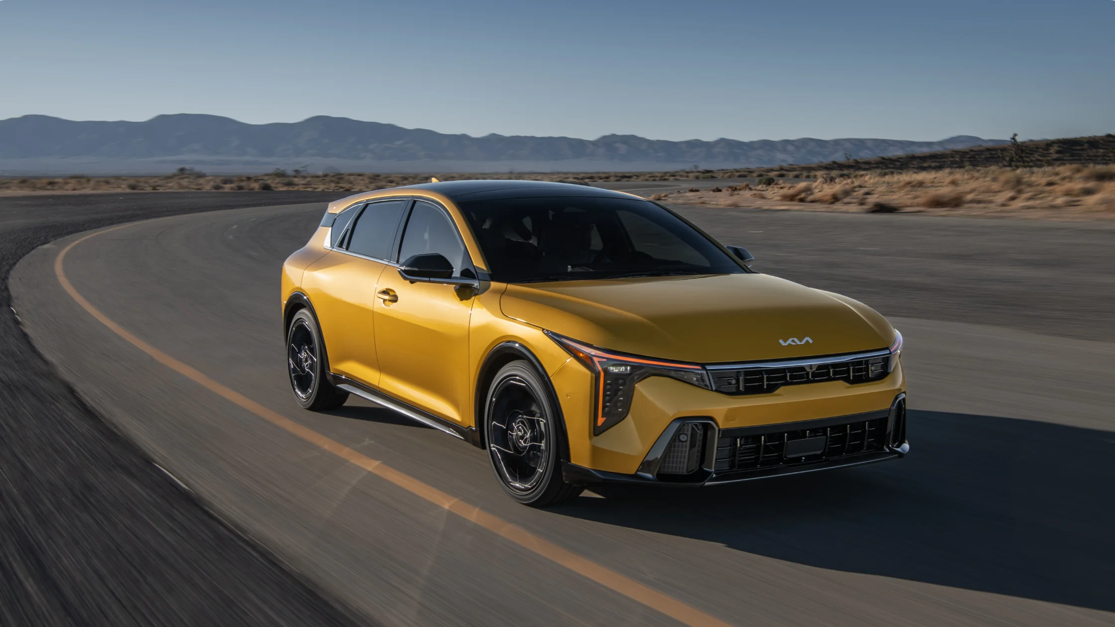 The design adopts Kia's contemporary styling cues with vertical illumination patterns and symmetrical geometry. The side profile exhibits clean lines and consistent panel alignment to reduce turbulence. The body panels use lightweight materials that support efficiency without compromising rigidity. Paint options include Sparkling Yellow, which highlights the contour and structure of the body design through reflective balance.